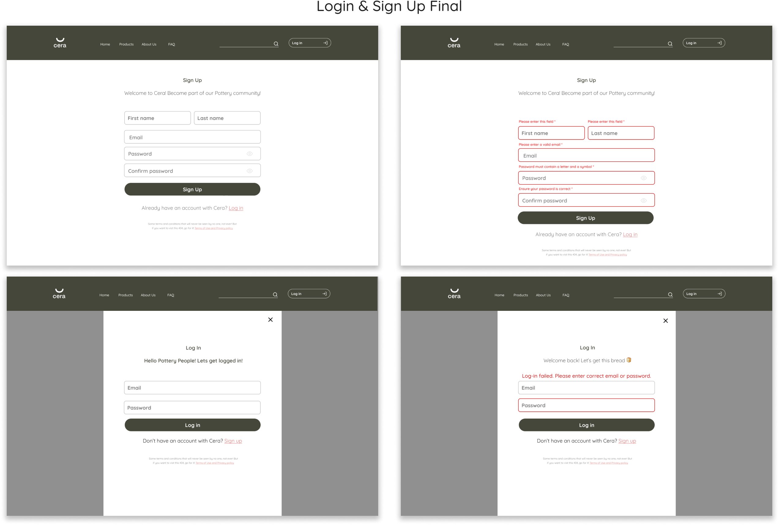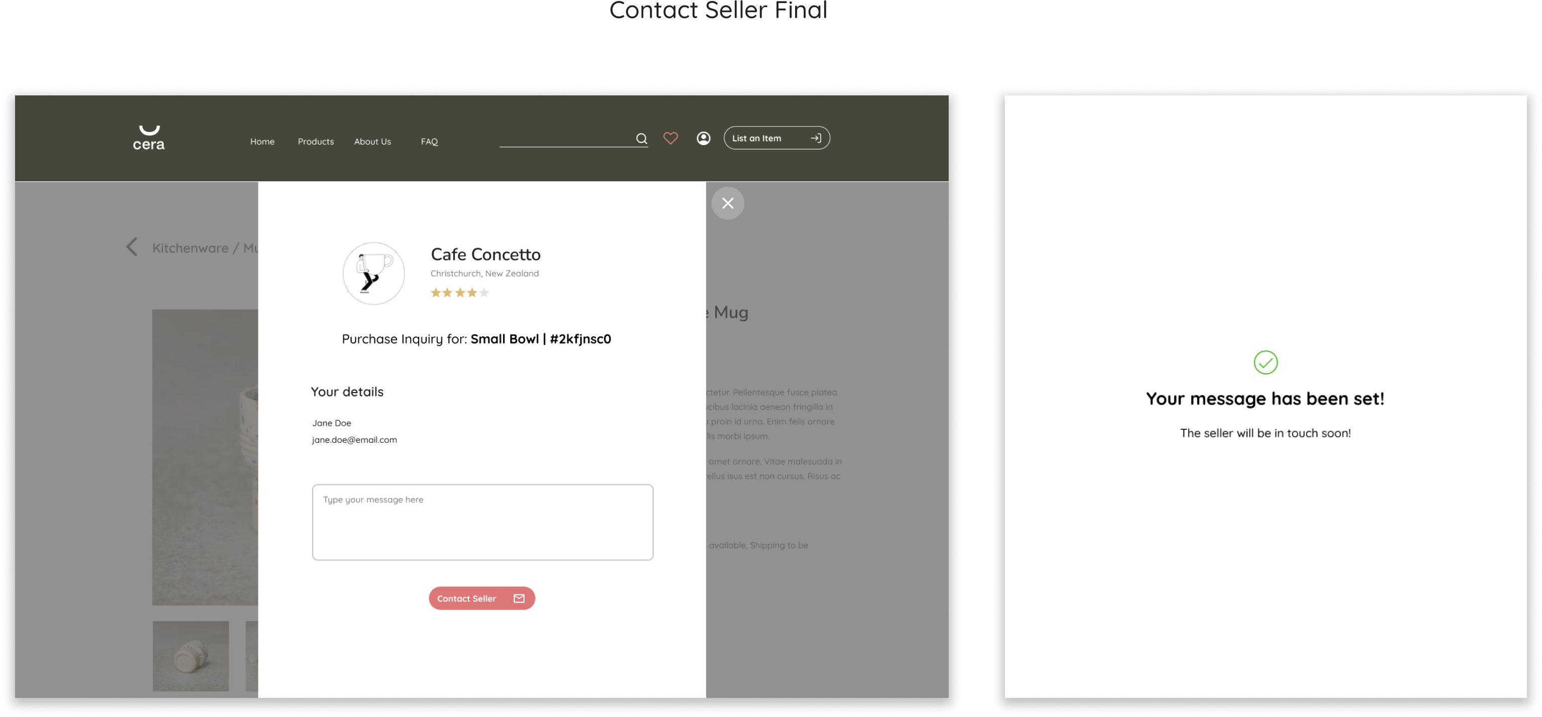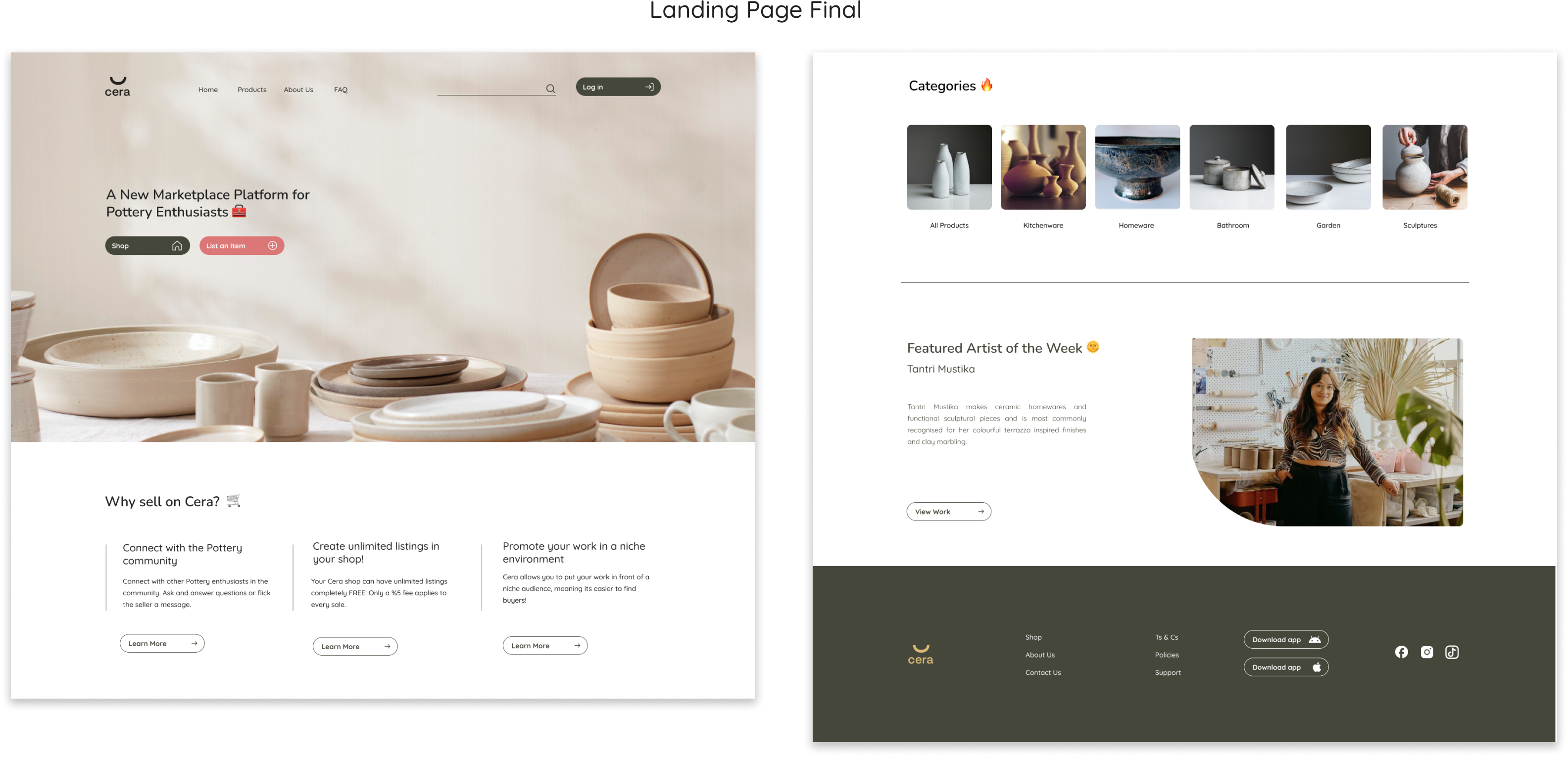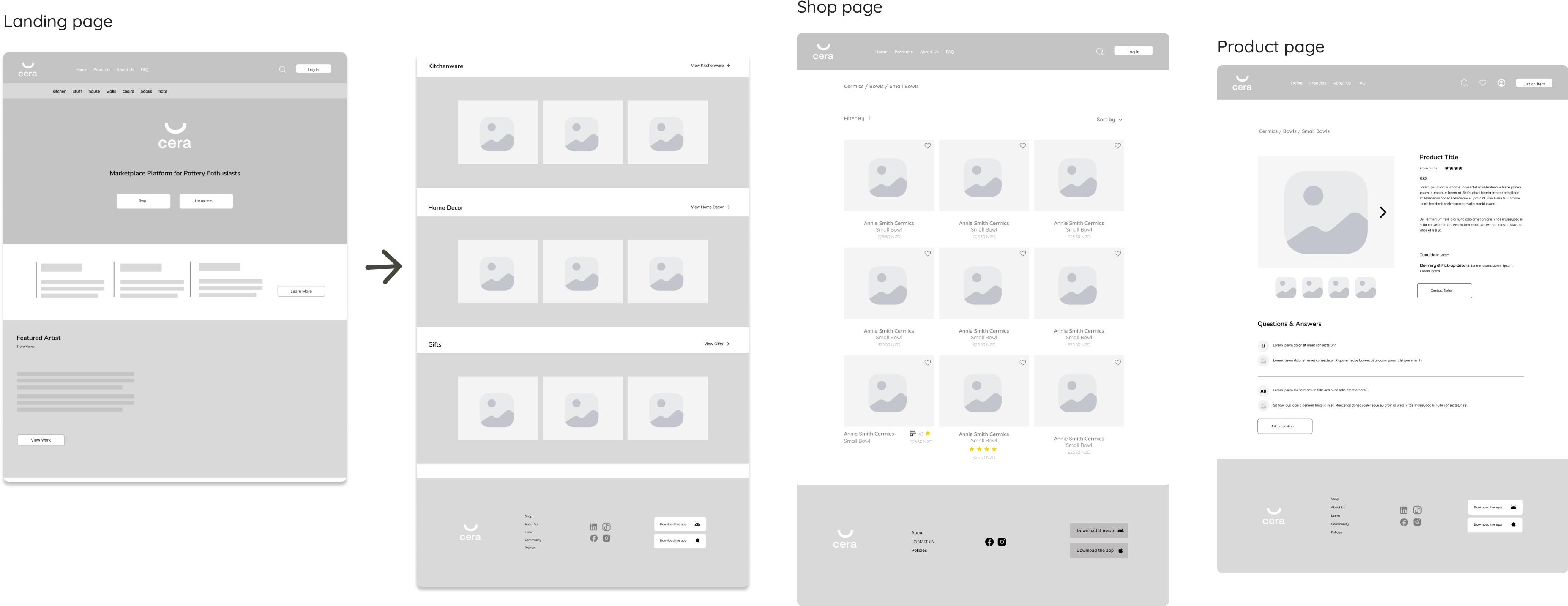This application will allow users to buy and sell new or pre-loved pottery from local artists and encourage community within people who have similar passions. Cera will have a simple and minimalistic pottery-themed front-end design. The minimum viable product (MVP) of this application will have these main features: (1) buyers will be able to browse all listed products, view collections, ask questions on an item’s page or contact the seller directly so they could make the purchase and communicate their needs and concerns privately, and (2) sellers will be able to easily list their products, create their public profile/shop page, view, edit or delete listings, reply to buyer queries and update their account information. Cera will facilitate the initial communication from a buyer to a seller, but ongoing correspondence will happen outside of the application, via email or SMS.